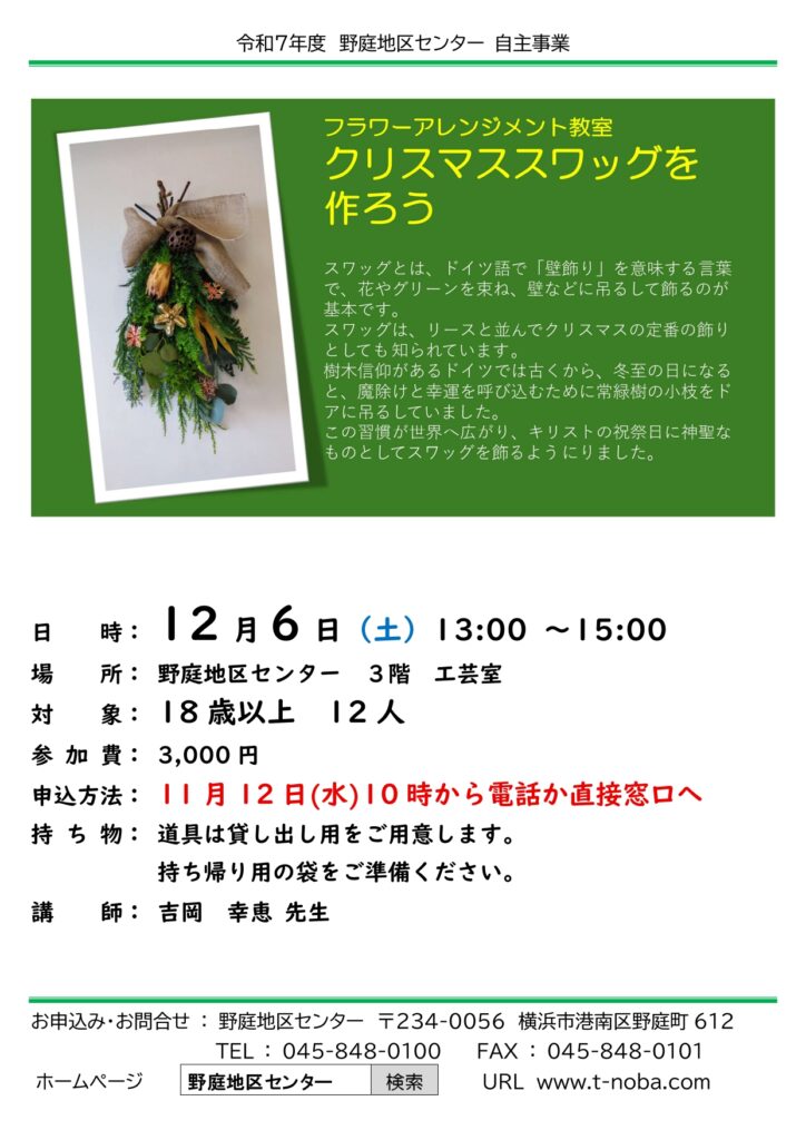 11月12日募集開始 フラワーアレンジメント教室「クリスマススワッグを作ろう」